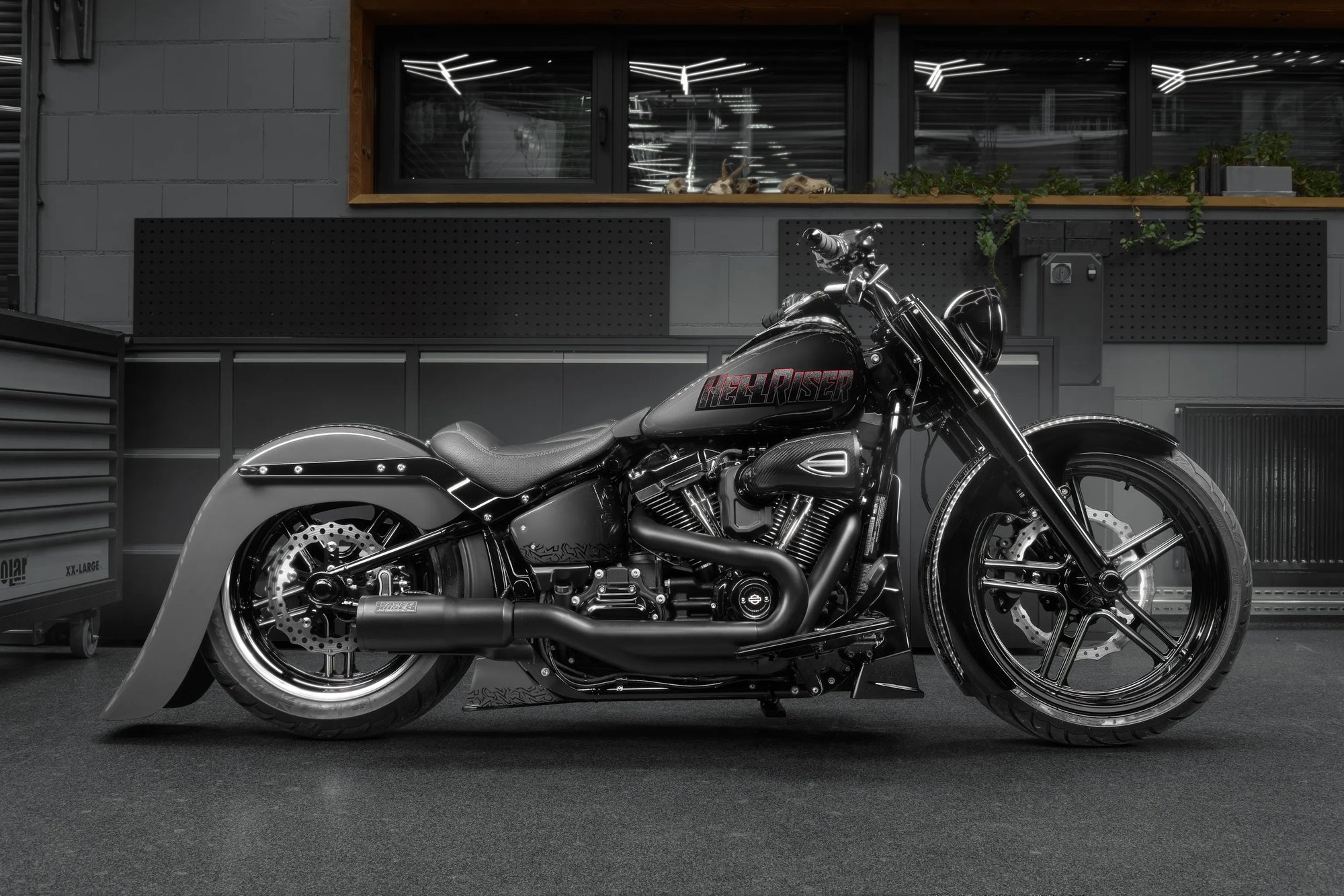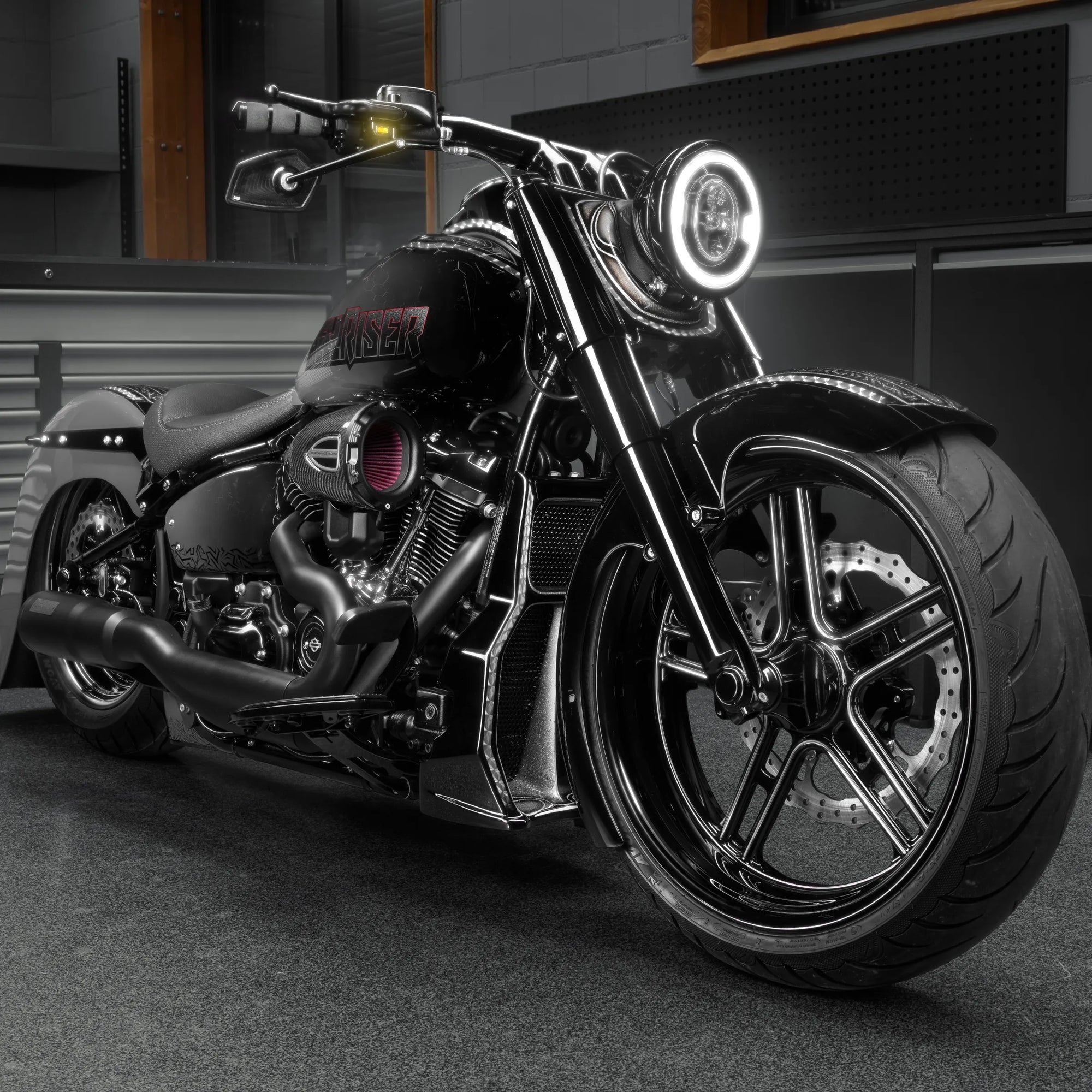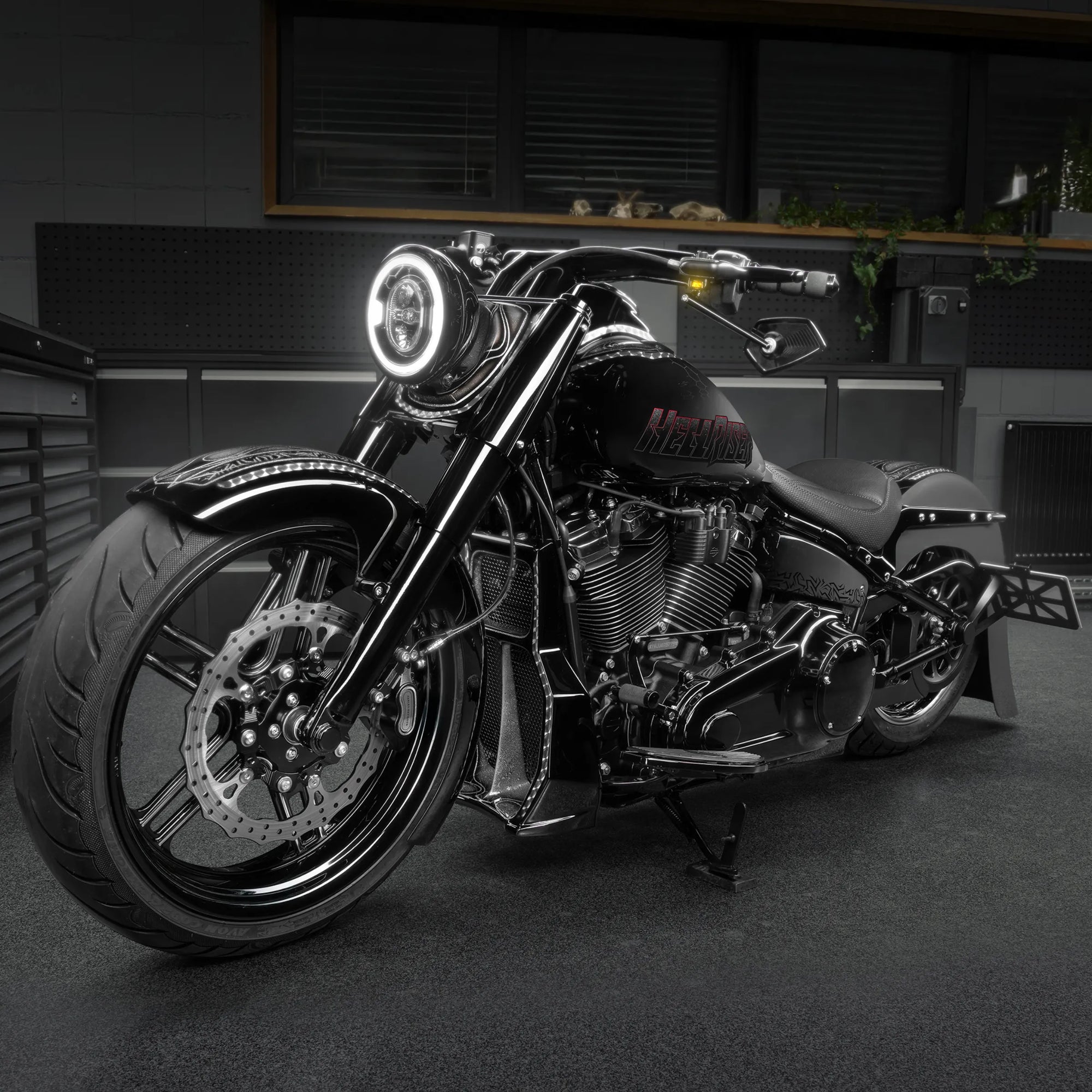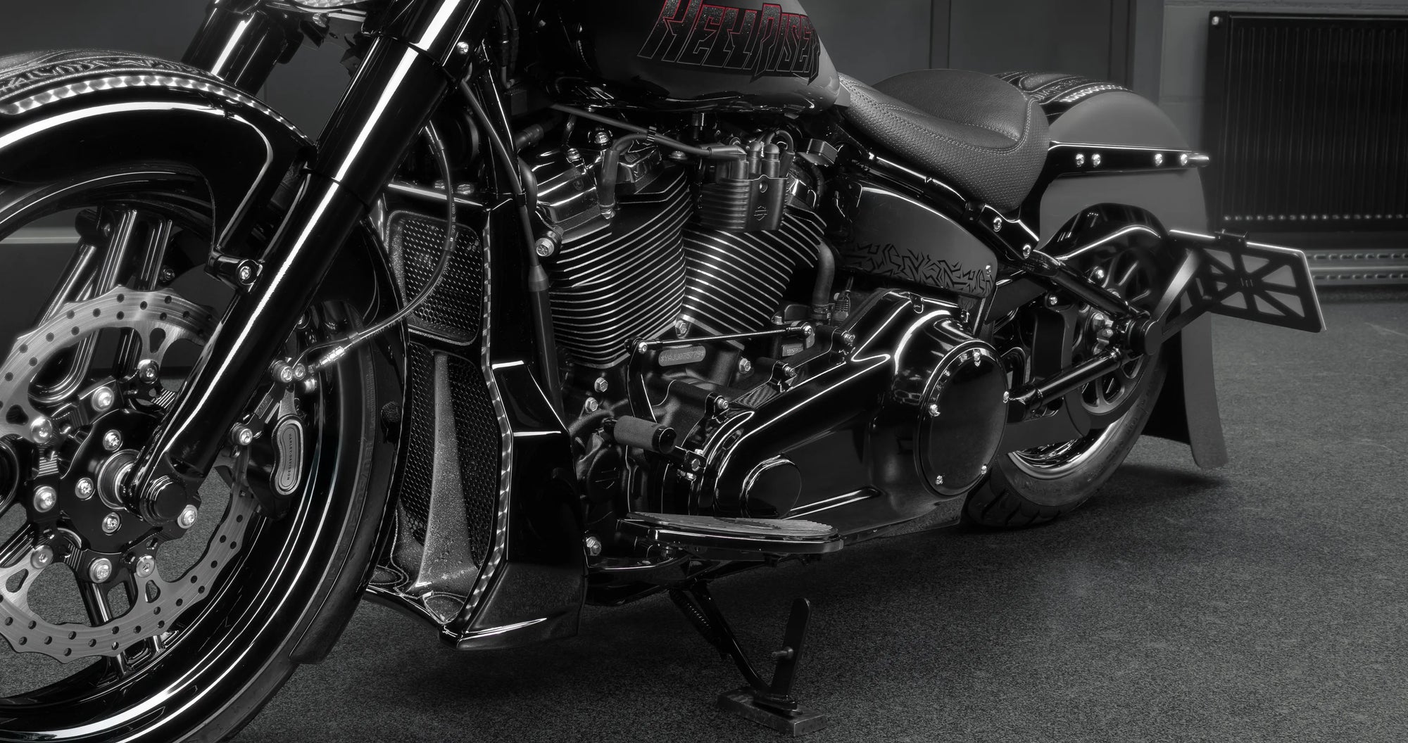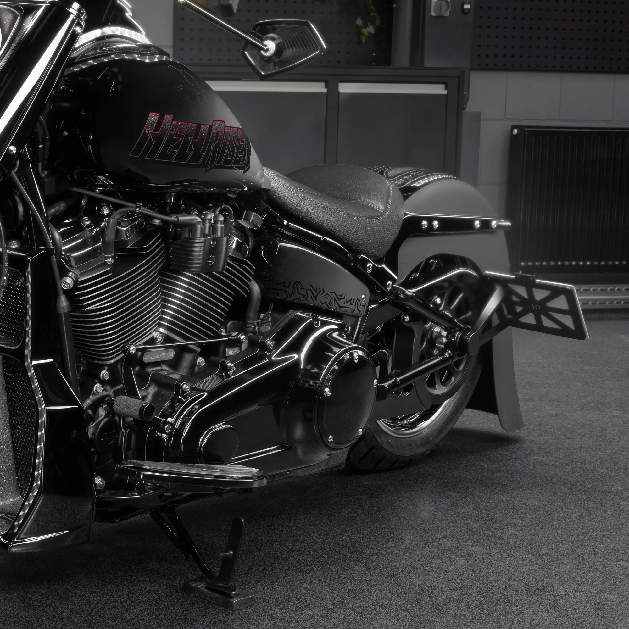 We present a new "Avenger" collection and our unique Chin Spoiler for Harley-Davidson M8 Softail models. Our New "Avenger" Series Wide Chin Spoiler will cover that ugly gap between frame and tire. Besides its functional design, the spoiler gives an aggressive and modern look to your Softail model line. Fits perfectly on the bike as all the parts required for installation are included.