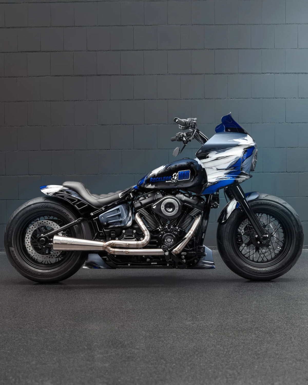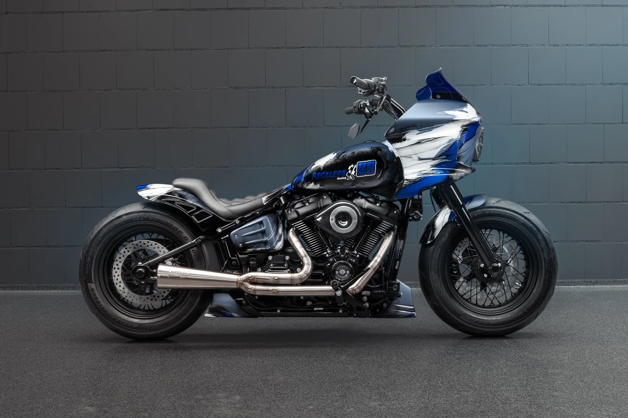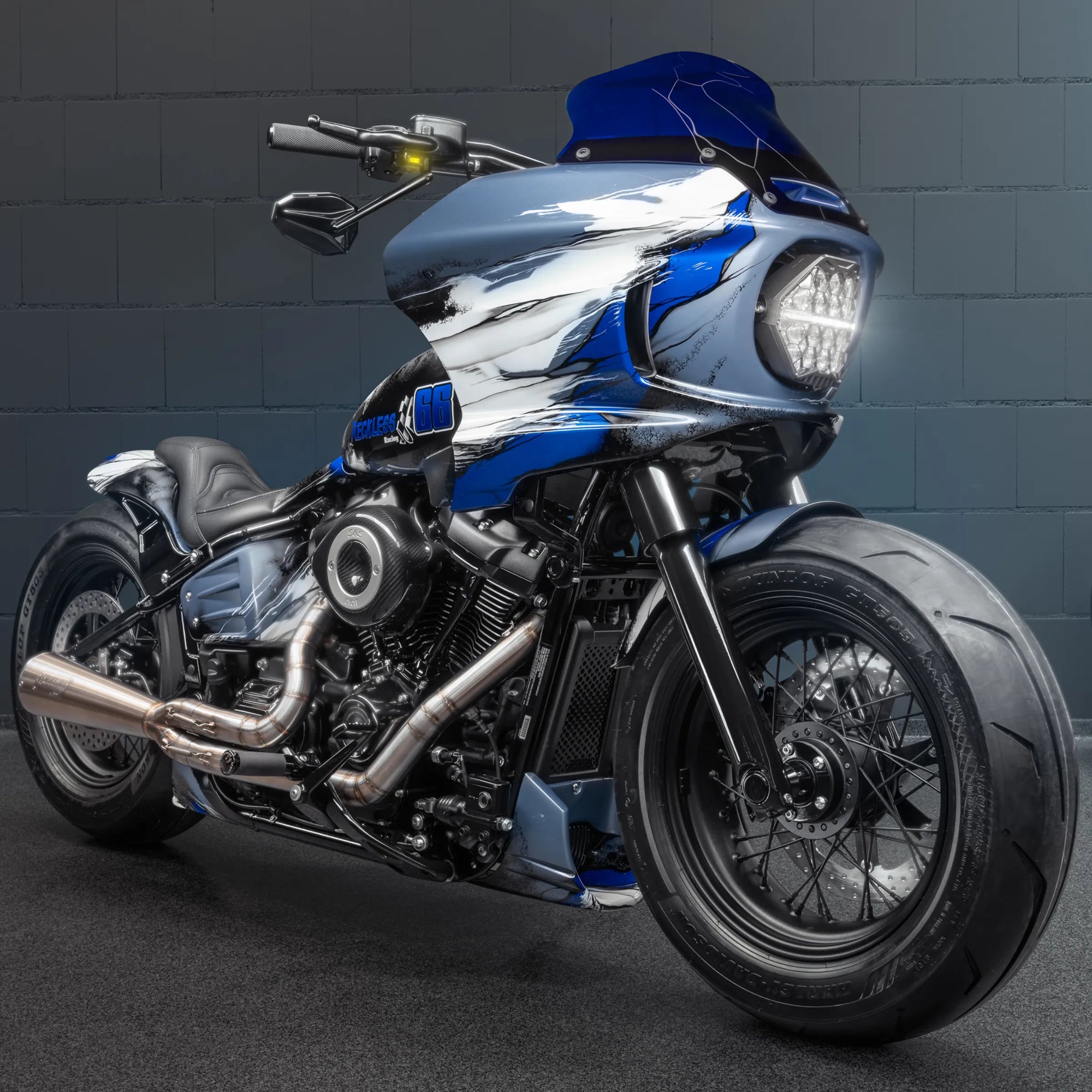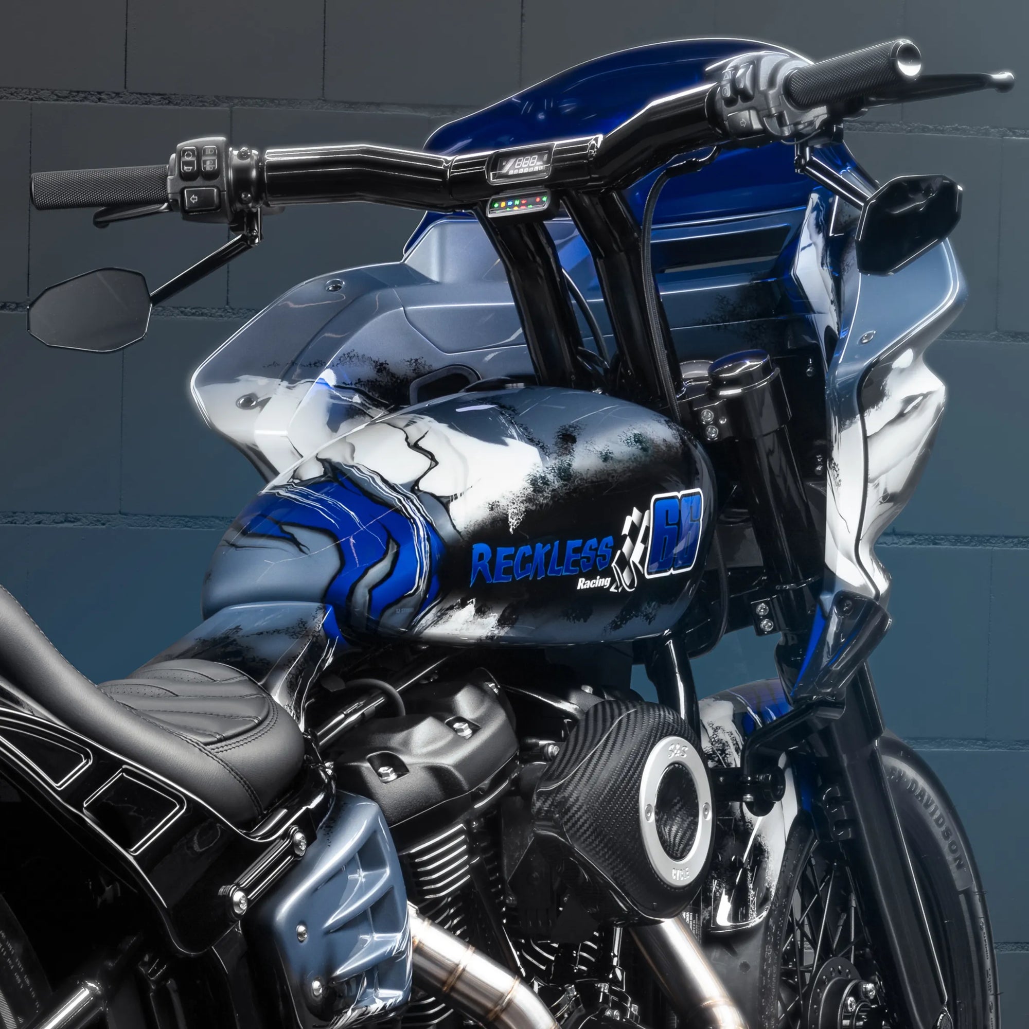 For this build, we drew inspiration from both architecture and muscle. Marble-inspired paint in shades of blue and white to create an impression of a sculpted surface, while the Street Bob’s frame provides the bulk and rawness of a true heavyweight. The end result is a bike that looks permanent, carved like a statue, yet built to ride hard. Artistry and pure Harley design.