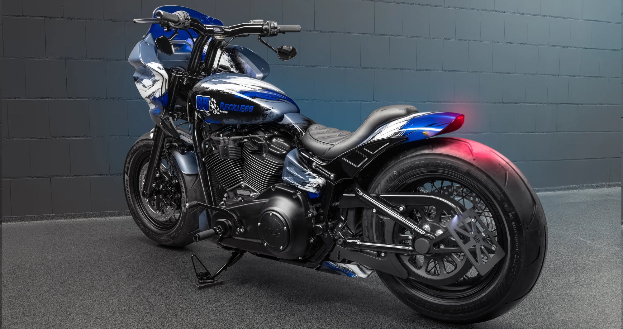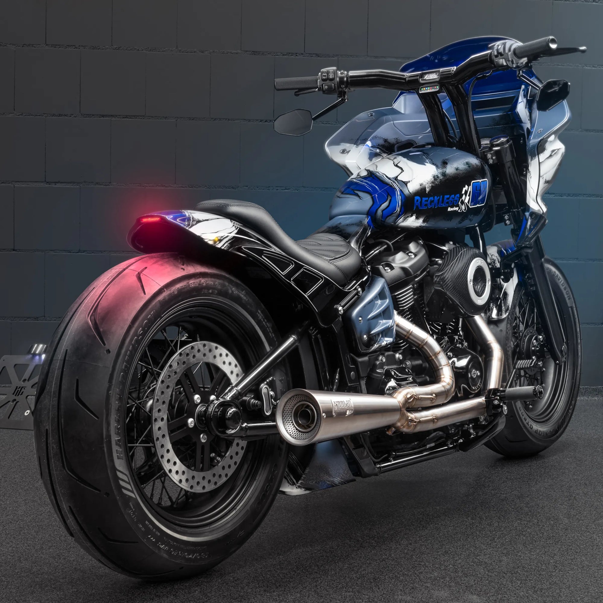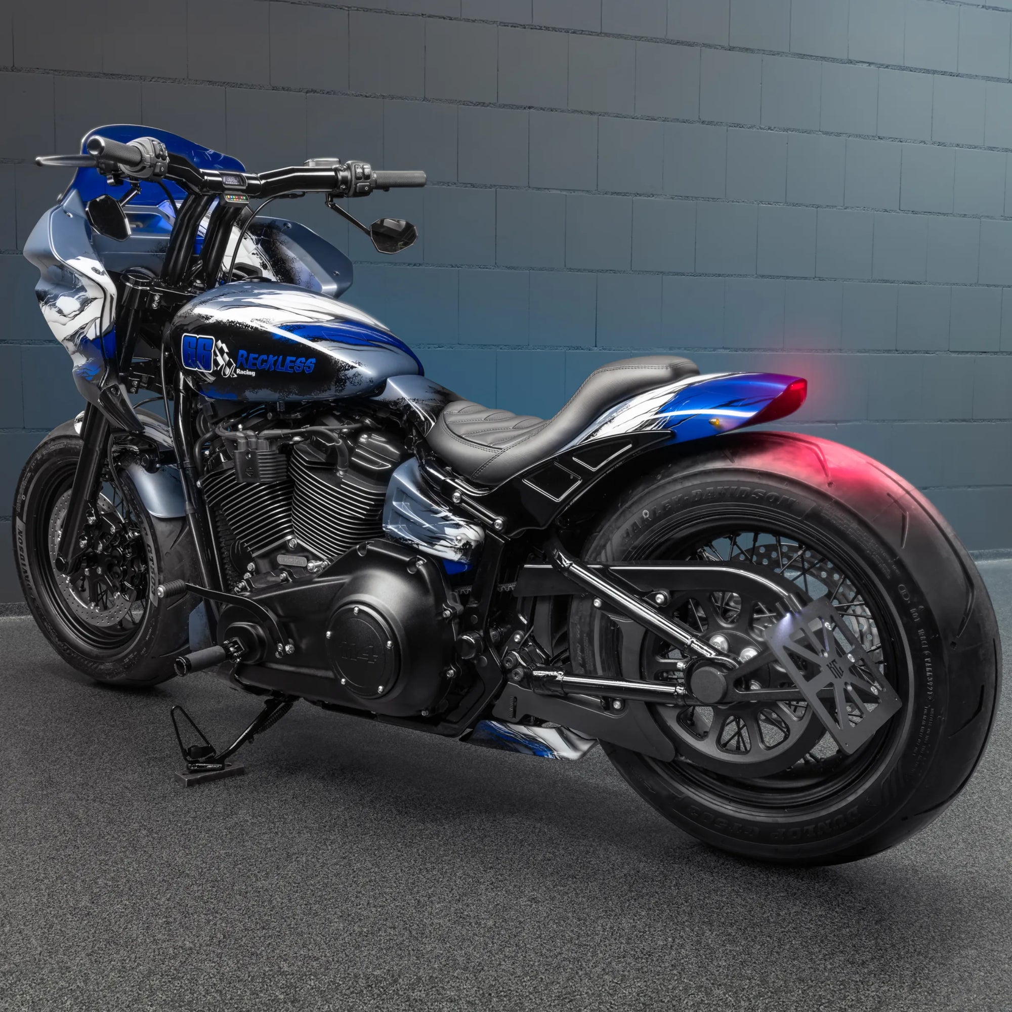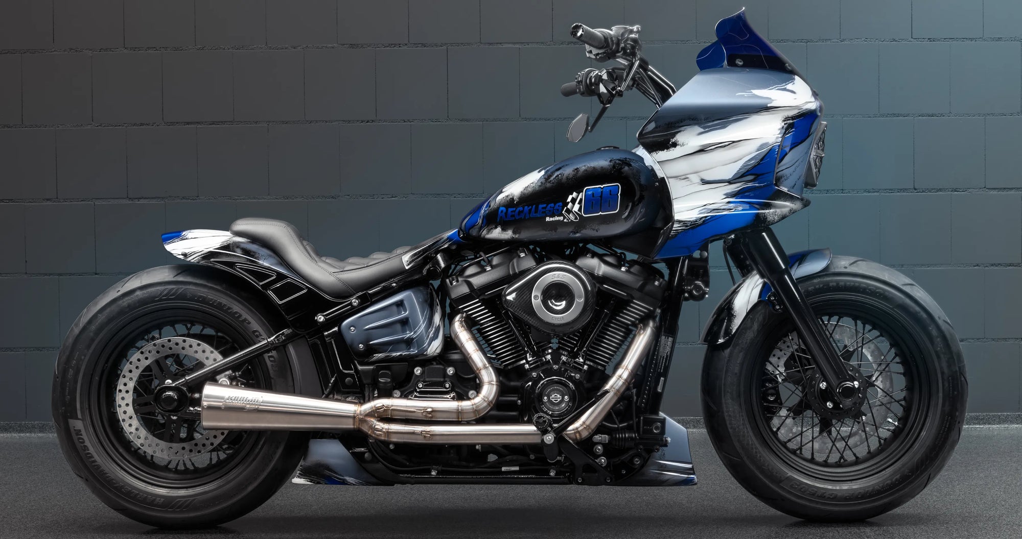 For this build, we drew inspiration from both architecture and muscle. Marble-inspired paint in shades of blue and white to create an impression of a sculpted surface, while the Street Bob’s frame provides the bulk and rawness of a true heavyweight. The end result is a bike that looks permanent, carved like a statue, yet built to ride hard. Artistry and pure Harley design.