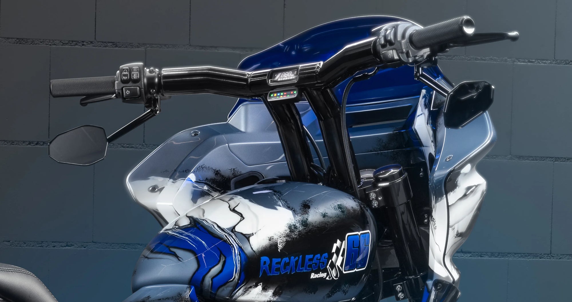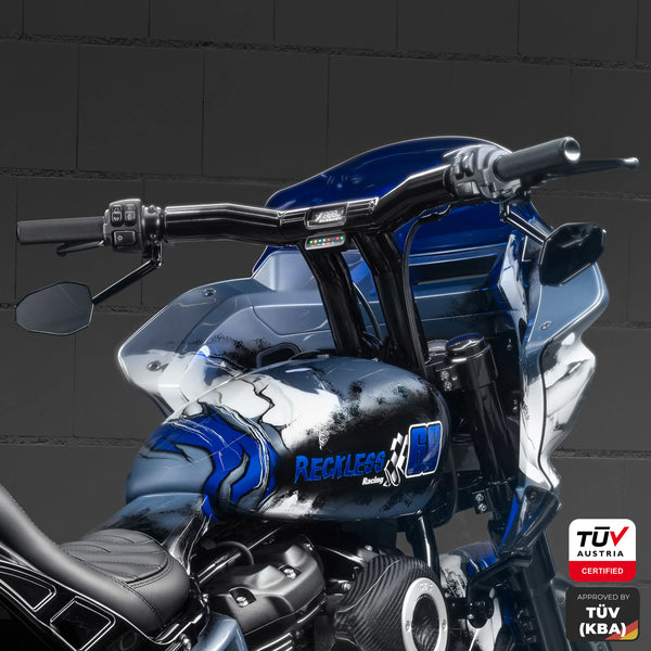 These bars feature a special Stealth View Speedometer Option, where an OEM-type speedometer is seamlessly flushed inside the bars for a super clean look. Wires for the speedometer are hidden inside the bars thanks to a specially designed tunnel that conceals all electrical wiring. To achieve this precision, the bars with the flush speedo option are crafted using 5-axis CNC machining from a solid chunk of steel. If you don’t already have this speedometer, you can get it from us – find it at our store.