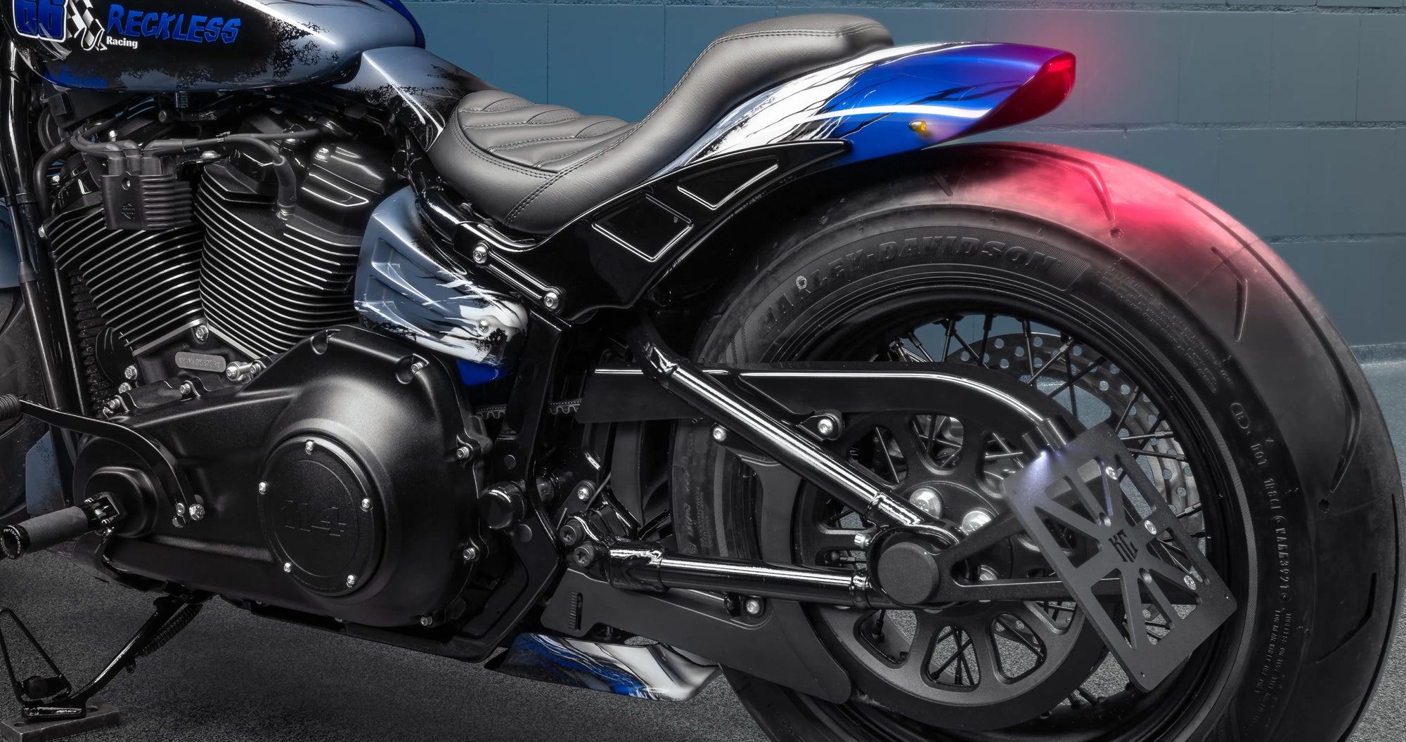 Killer Custom side or center license plate holder with LED license plate light (DOT and E-Approved) is a real eye-catcher. Our "Web" side license plate has a great look and can be attached with-Different plate holders (sold separately) any place you like.