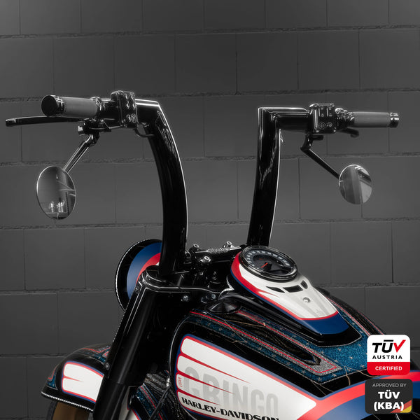 These massive 2" diameter handlebars are designed for Harley models with 1.25" risers, including Throttle-by-Wire setups. They’re available in 4", 6", 8", 10", or 12" rise.