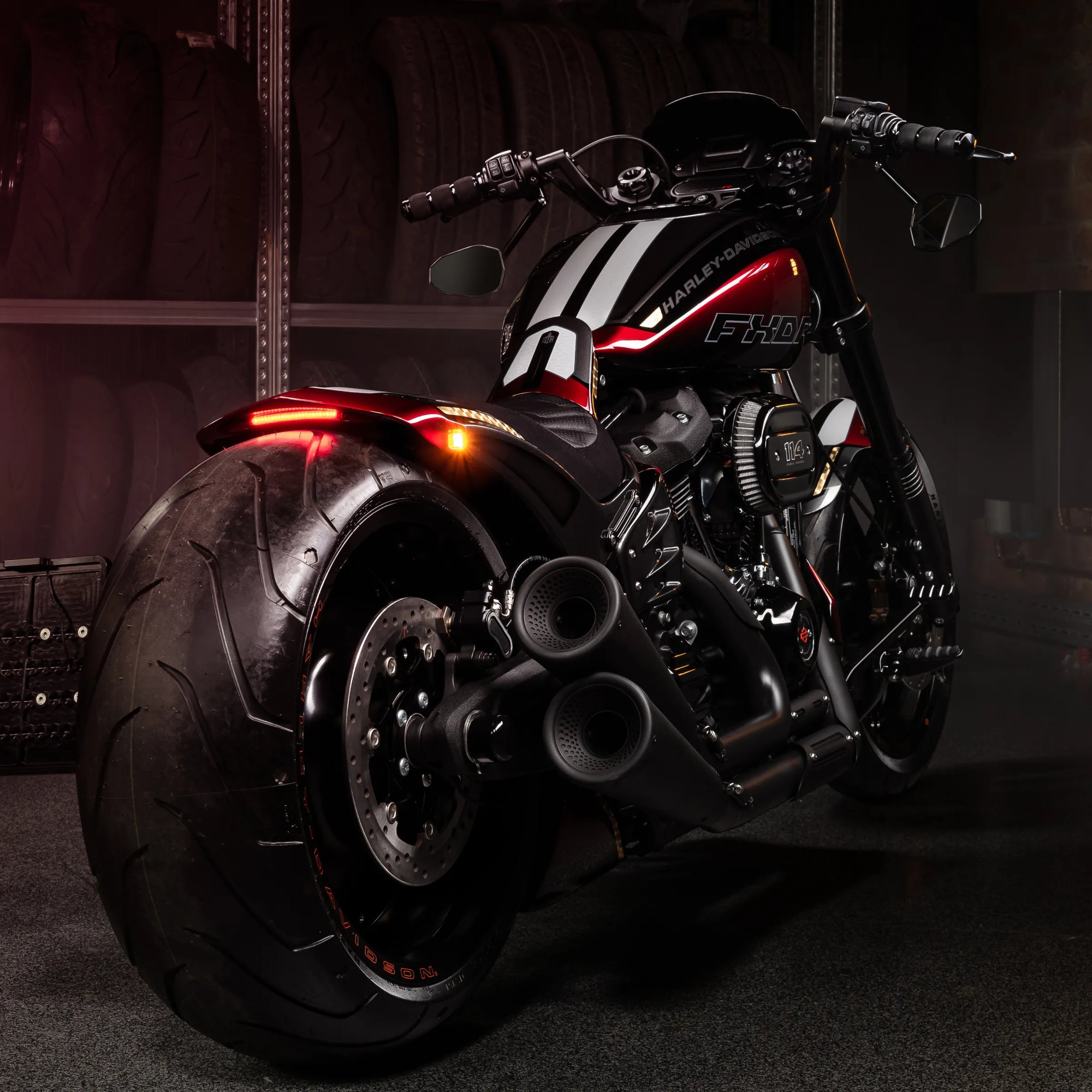 We present our new "Avenger" collection and our unique rear fender for FXDR, Breakout & Fat Boy Harley-Davidson M8 Softails. The "Avenger" fender comes with the rear and turn lights included in the package. Also, it has integrated struts, so it can be used with solo or solo and passenger seats. It comes with a matching solo seat pan. Matching custom seats with upholstery can be ordered separately in case you want a full custom to rear-end look. It will fit 240-260 mm rear tires.