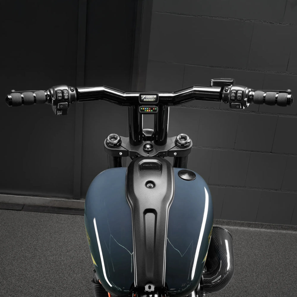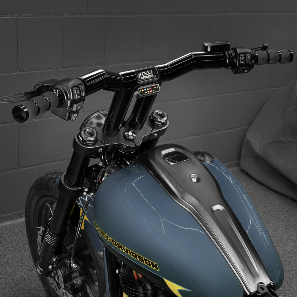 These bars also feature the Stealth View Speedometer Option: an OEM-style speedometer is seamlessly flushed into the bars for a super clean look. The wiring is fully concealed inside a custom internal tunnel, keeping everything tidy. To achieve this level of precision, the bars with the flush speedo option are CNC-machined from a solid chunk of steel using 5-axis technology. Don’t have the speedometer yet? You can grab it directly from our store.