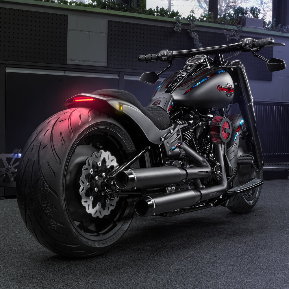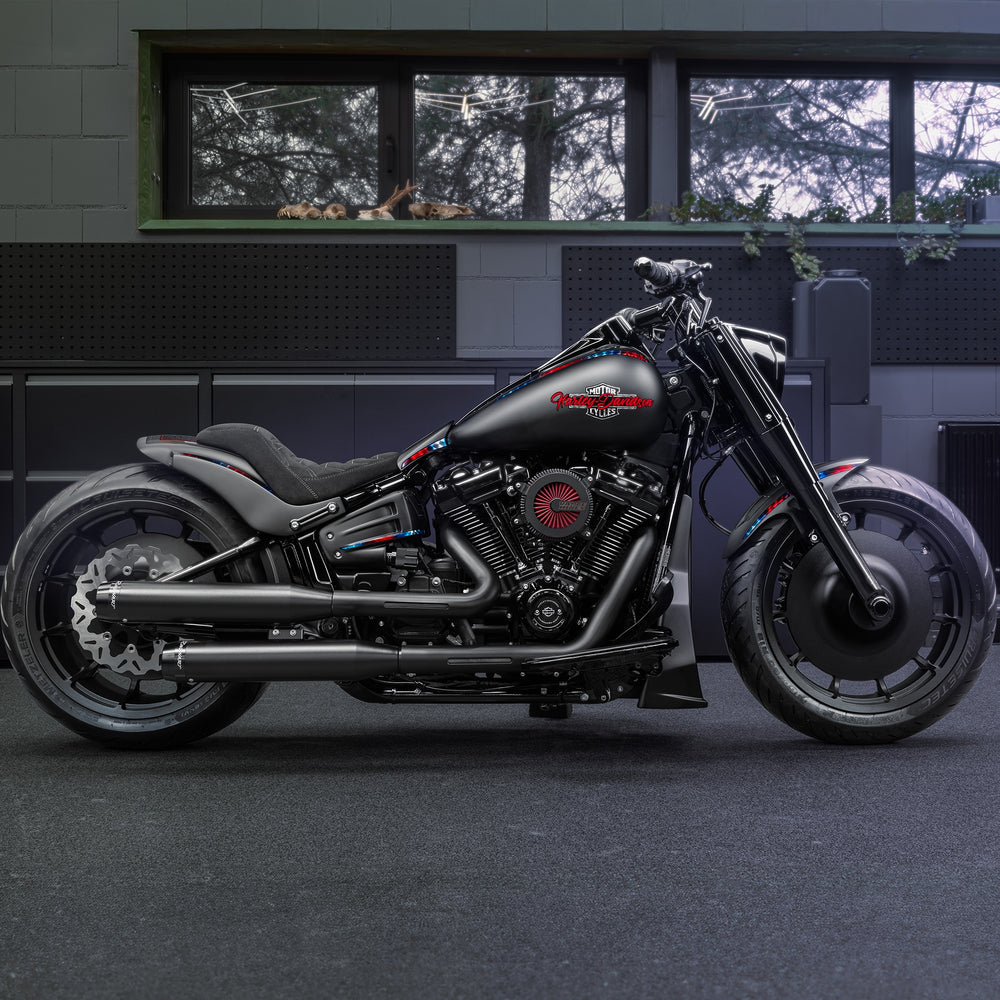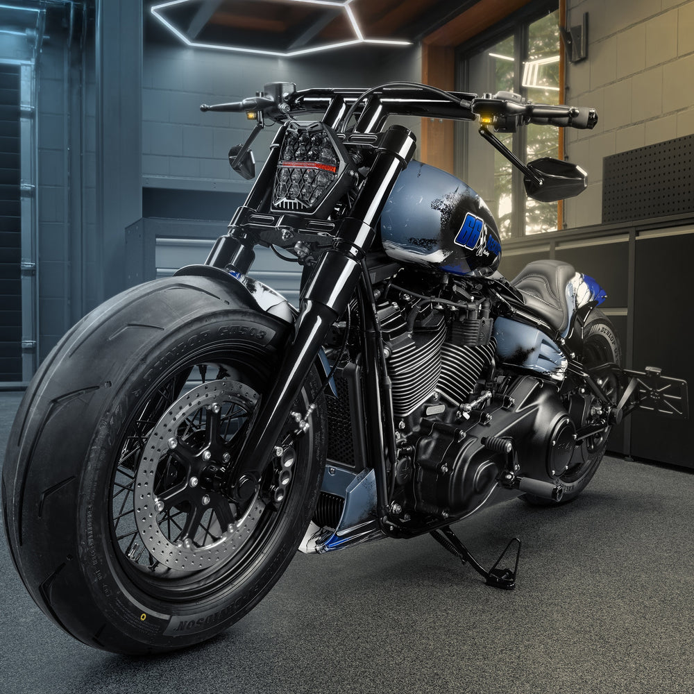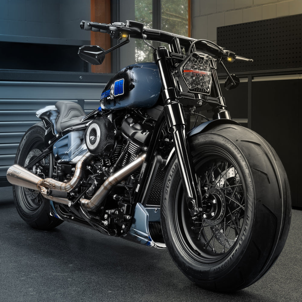 Both 'Killer Bull' and 'Monarch' handlebars share the same aggressive style and overall look. The main difference lies in the fit: 'Monarch' bars are slightly narrower at the lower section, making them a perfect match for bikes with narrow triple trees like the Street Bob (FXBB) and similar models. 'Killer Bulls' are designed to fit wider triple trees, making them ideal for models like the Fat Boy, Heritage, or Low Rider S. That said, both models will fit all Softail models—so in the end, it’s really just a matter of personal taste and design preference.