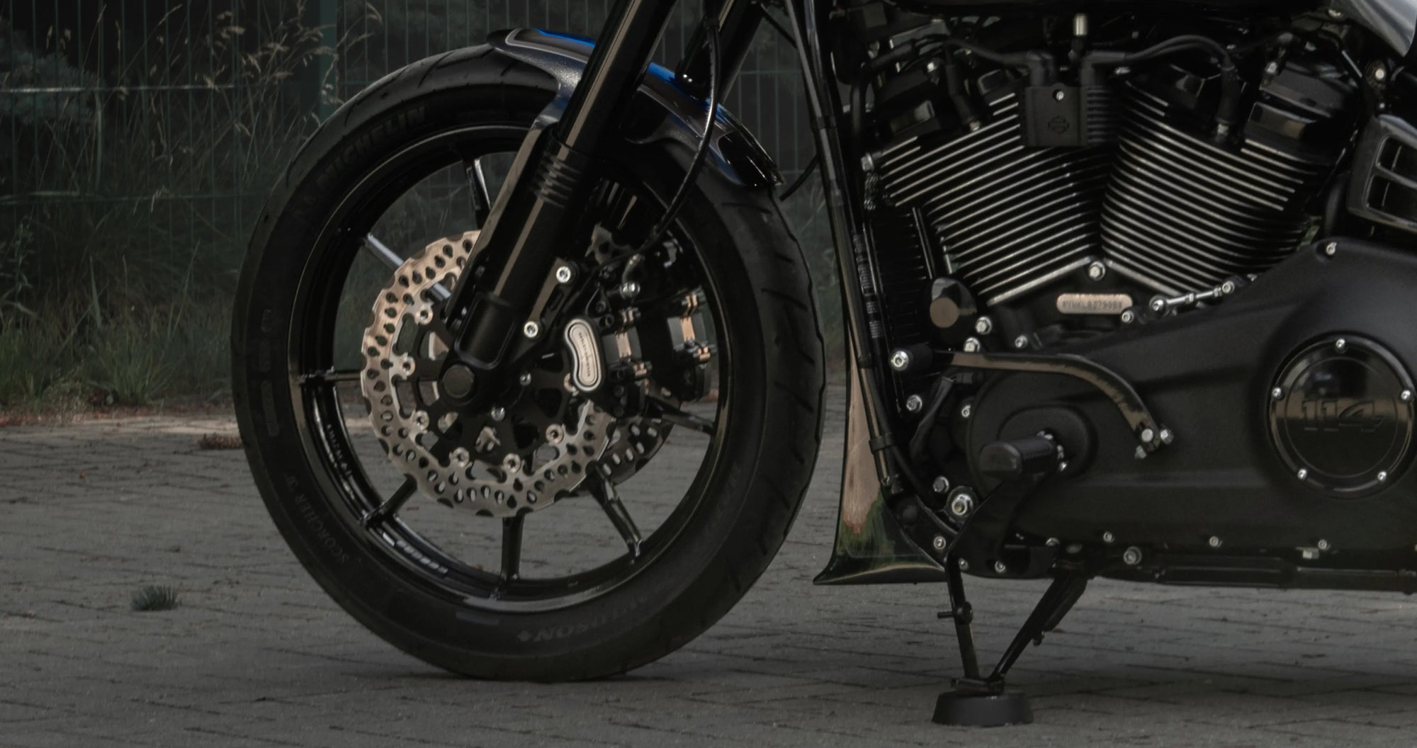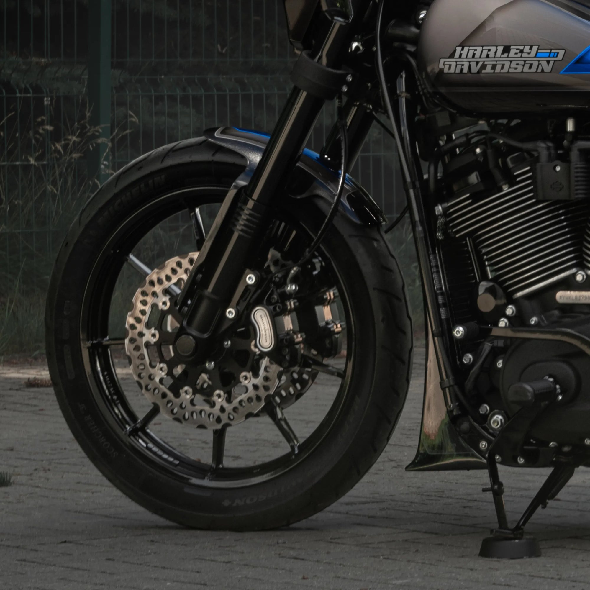 The new exclusive grooved lower fork covers. The entire fork appears smooth as the chrome fork tubes are covered. Your fork will look completely black and create a new brand look for your Softail FXDR 114. The covers are fixed with the front fender and the brake caliper so it fits securely. Gloss black powder-coated! Also will fit original or custom front fenders.